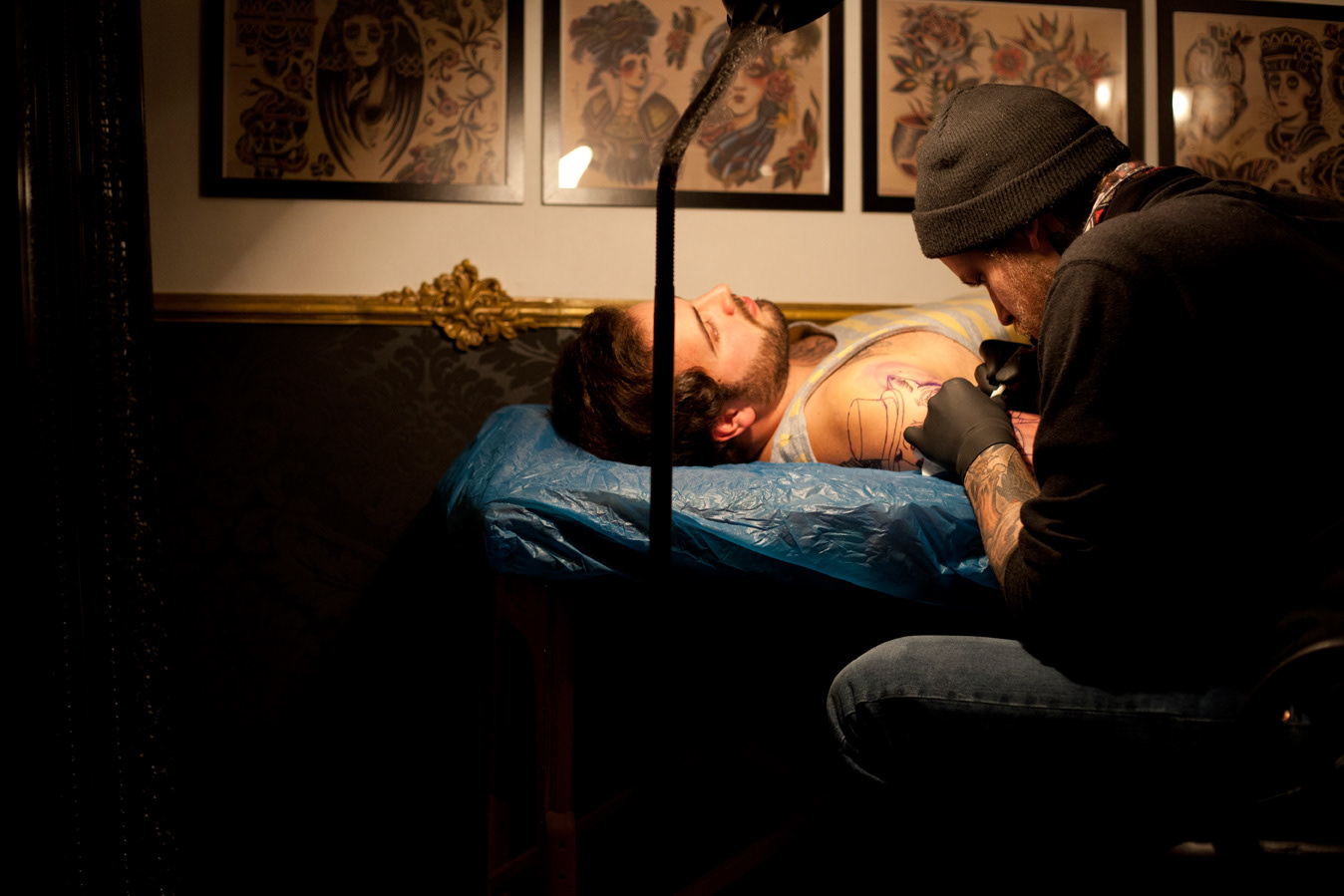 Diese fotografische Arbeit porträtiert Florian Schmidt, einen Tattookünstler, während seiner Arbeit. Es geht weniger um ein Gesamtbild der Person als um den Arbeitsalltag, sowie die von Ihm geschaffene Welt seines Shops. Als privates Projekt begonnen, wurde es letztendlich für einen Kurs an der FH Dortmund, unter der Leitung von Markus Neis ausgearbeitet. Danke an Florian Schmidt (Leibgeschneidert, Electric Scarabeus, The Black Mess) und Patrick.